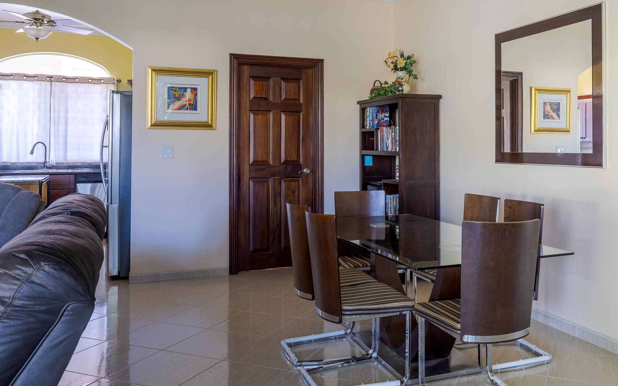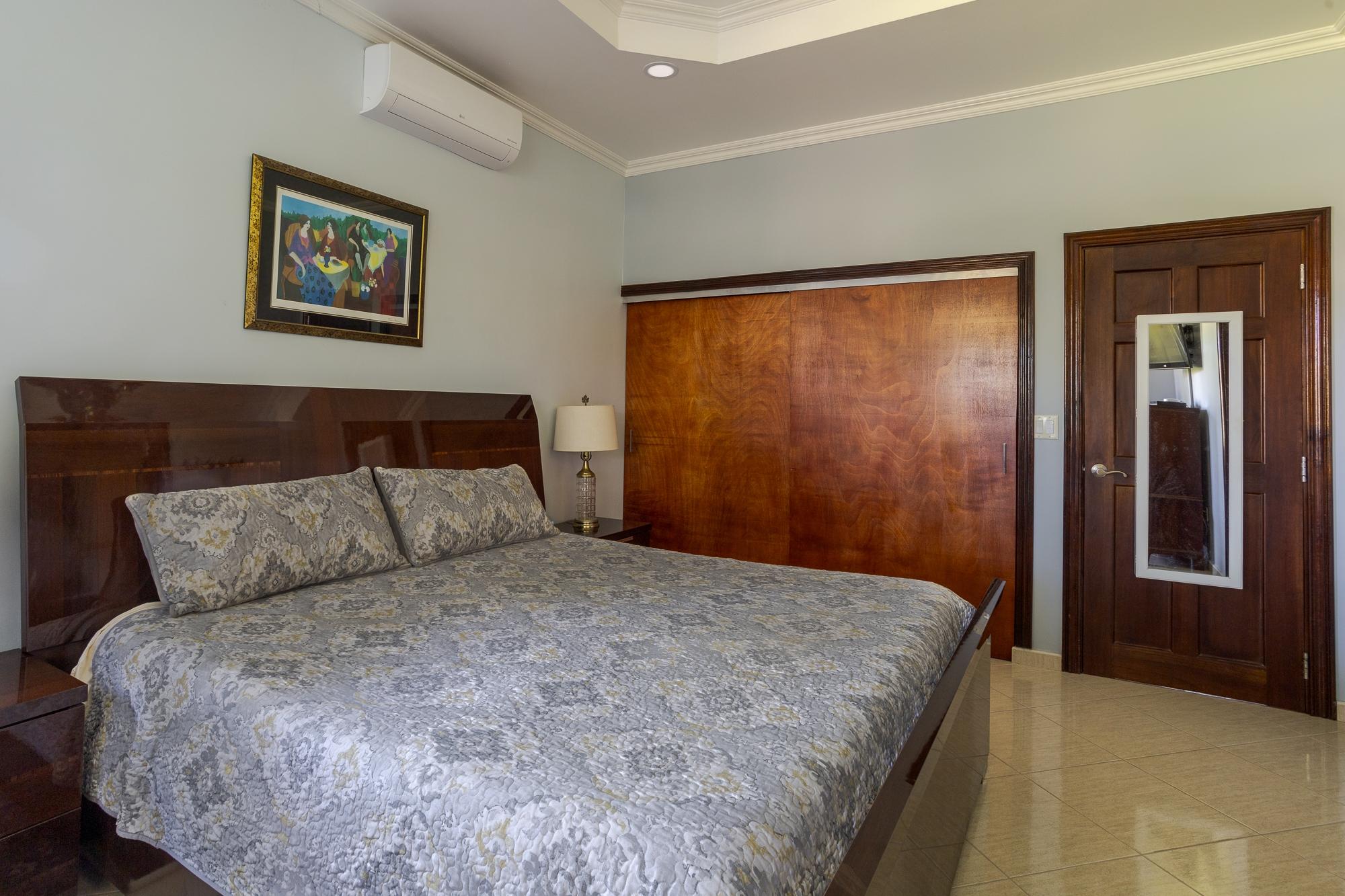 En el extremo tranquilo de una calle privada, esta casa adosada llave en mano, ubicada en el pueblo de Boquete Canyon, está lista para mudarse. A su llegada, le espera una amplia zona de aparcamiento cubierta con espacio para dos vehículos, flanqueada por pintorescas palmeras y flora ornamental. Pase por la puerta principal para descubrir un espacio habitable de concepto abierto cuidadosamente diseñado, que fluye a la perfección hacia un área de comedor y más allá hacia una cocina bien equipada. Además, la cocina, que cuenta con una distintiva entrada en forma de arco, ofrece funcionalidad y estilo. Al entrar a la cocina, sentirás la calidez que emana de los gabinetes de madera. Cuenta con una pintoresca ventana arqueada que ofrece vistas panorámicas de las majestuosas montañas. Además, la cocina cuenta con electrodomésticos esenciales, como refrigerador, estufa, horno microondas y lavavajillas. El amplio espacio en la encimera brinda mucho espacio para la preparación de comidas. El corazón de la casa se abre a una acogedora sala de estar, con un bar incorporado, donde podrá saborear sin esfuerzo momentos de convivencia. Los amplios ventanales del piso al techo enmarcan vistas cautivadoras del hermoso patio ajardinado, invitando al exterior a entrar e infundiendo cada rincón con luz natural y tranquilidad. Las puertas corredizas de vidrio conducen a un santuario al aire libre, adornado con exuberantes palmeras.