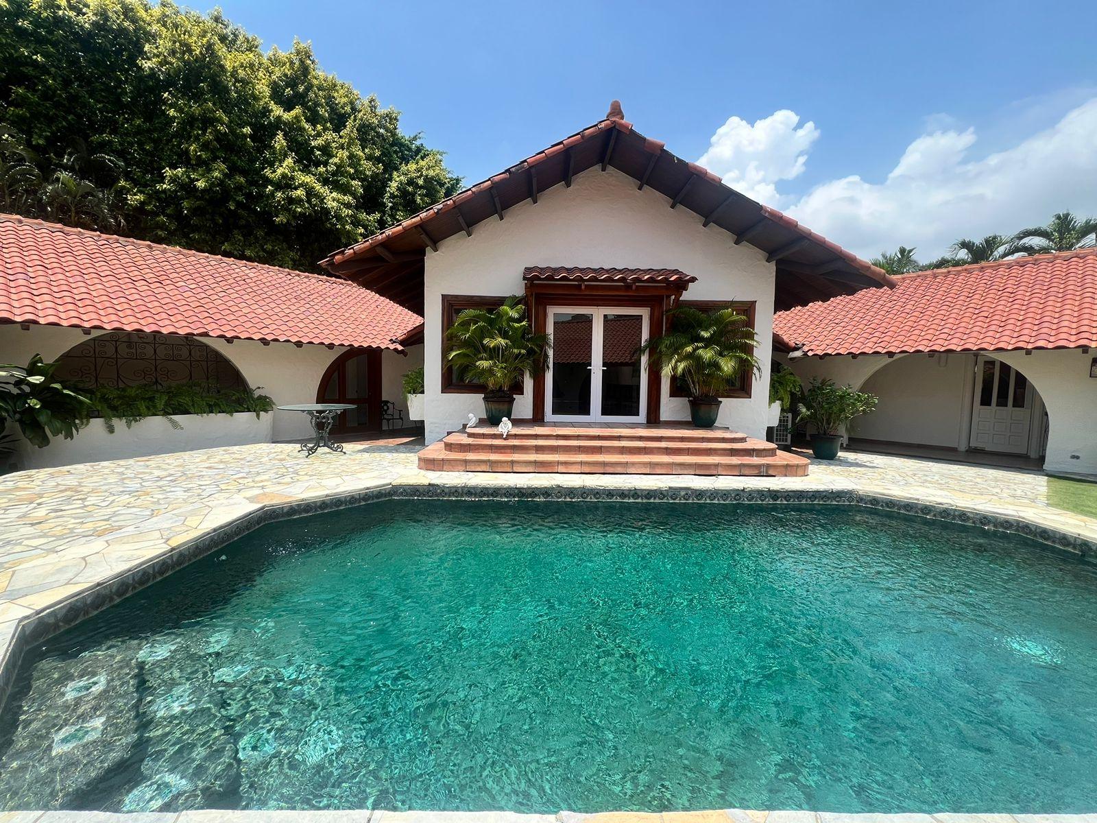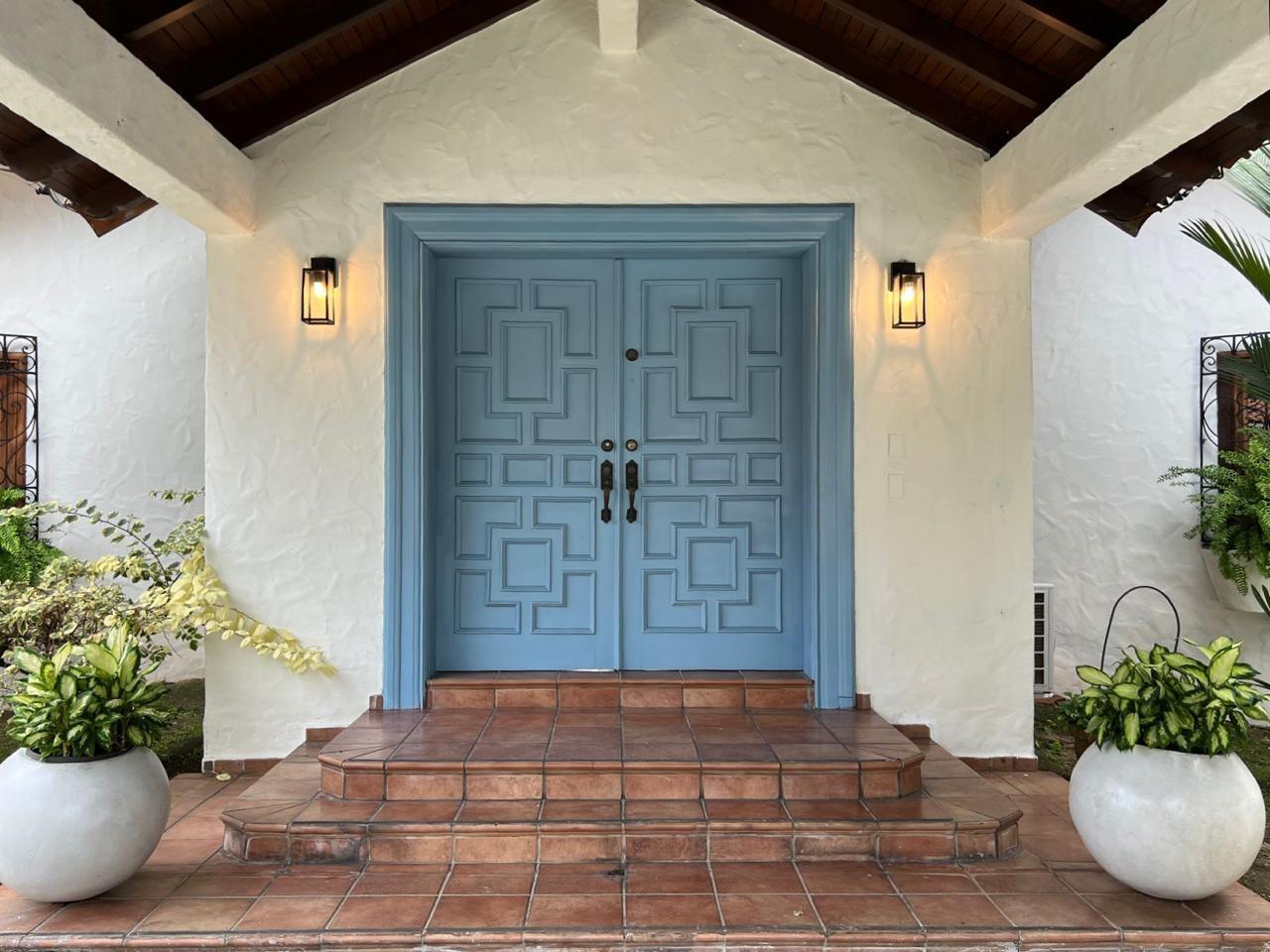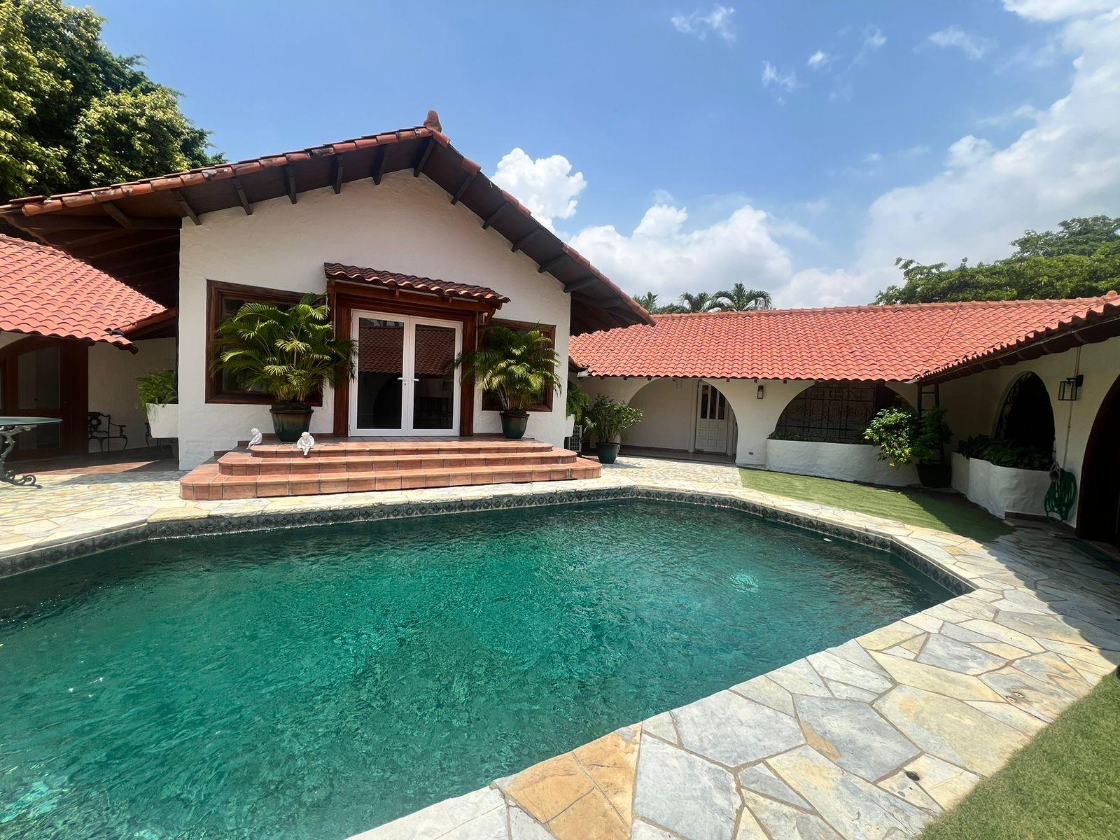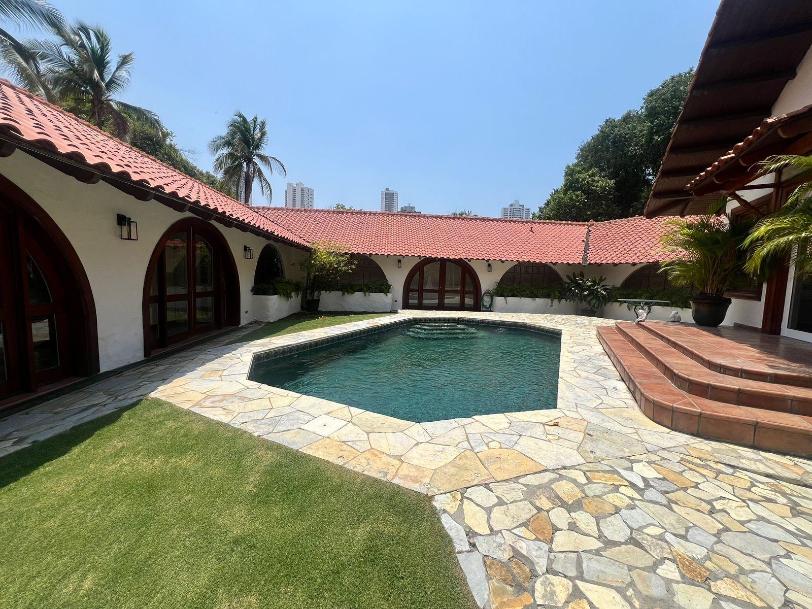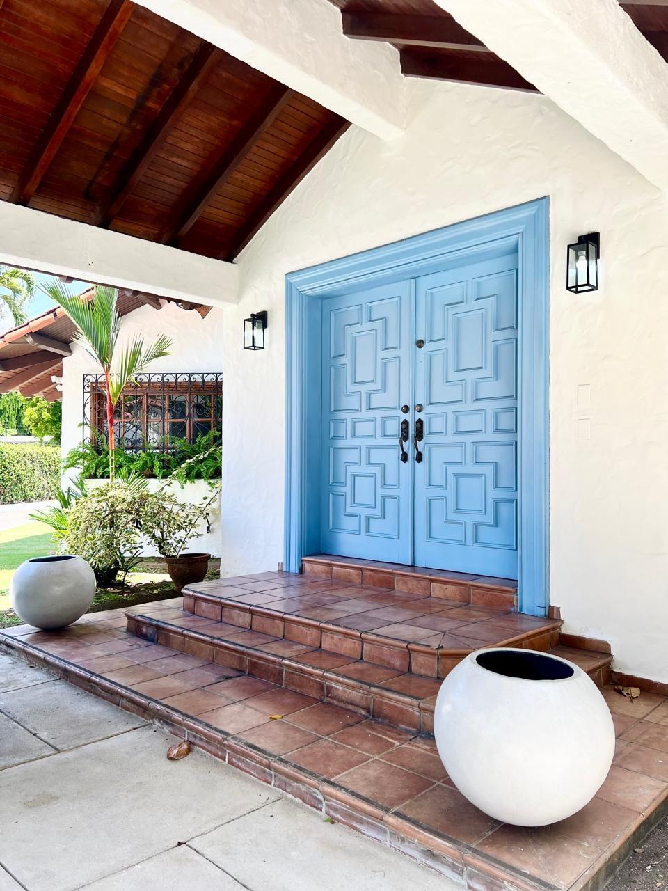 Casa Hacienda, ubicada en Altos del Golf, Ciudad de Panamá, es una imponente residencia de estilo español colonial, diseñada para evocar la época de los 1800s. Destaca por su privacidad y exclusividad en una calle tranquila. Construida en 1998, ofrece una entrada majestuosa con puertas dobles celestes y techos abovedados de madera. El interior presenta características coloniales como estuco blanco, terracota y vigas de madera expuestas. La casa incluye una suite principal espaciosa, cuatro recámaras adicionales, cada una con sus baños y closets, áreas de entretenimiento como un bar y sala familiar, y una oficina biblioteca. Amenidades exteriores como piscina, jardín exuberante y una habitación independiente. Altos del Golf ofrece cercanía a parques, centros médicos y comerciales. Casa Hacienda es una opción de lujo para quienes buscan estilo de vida urbano y serenidad.
