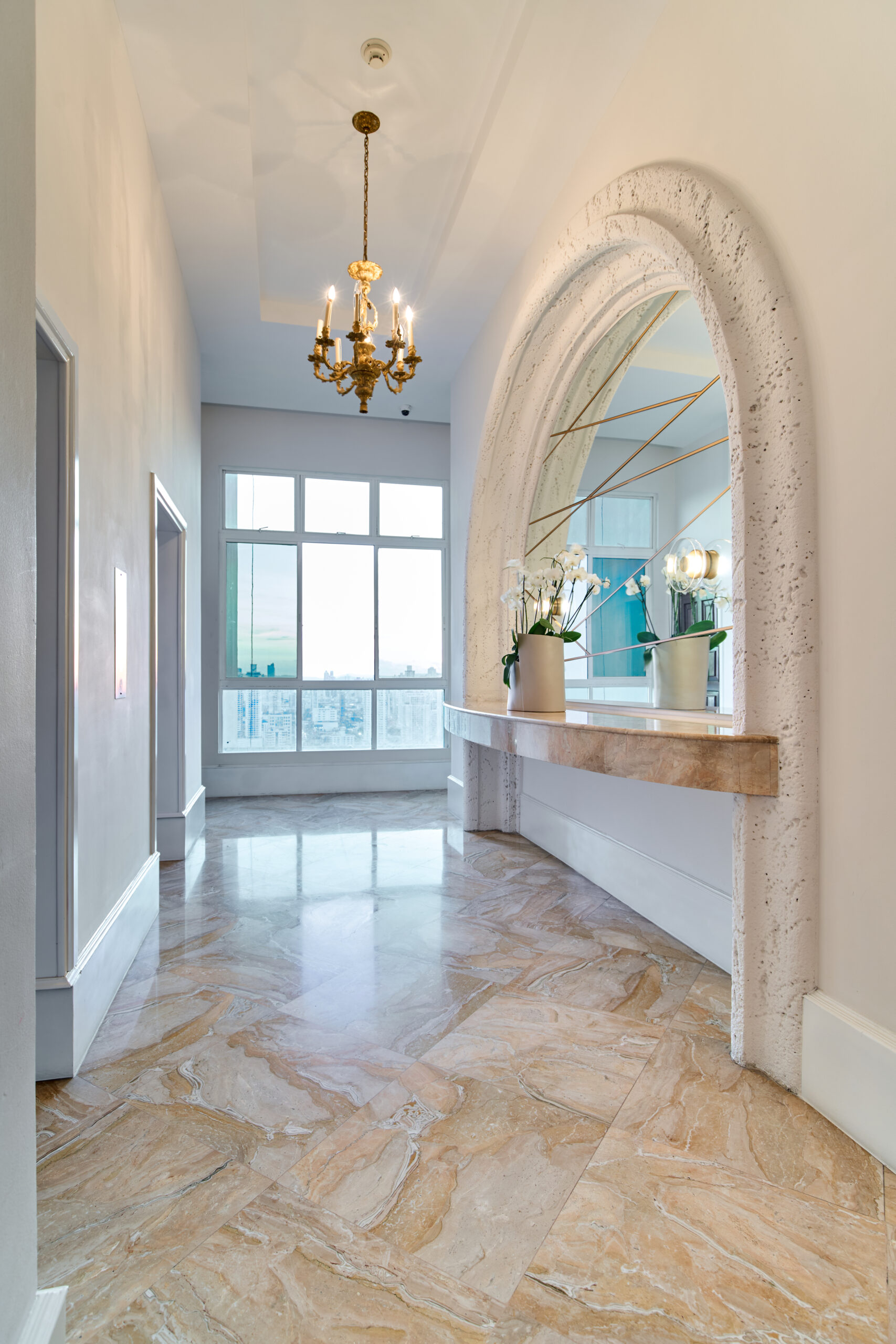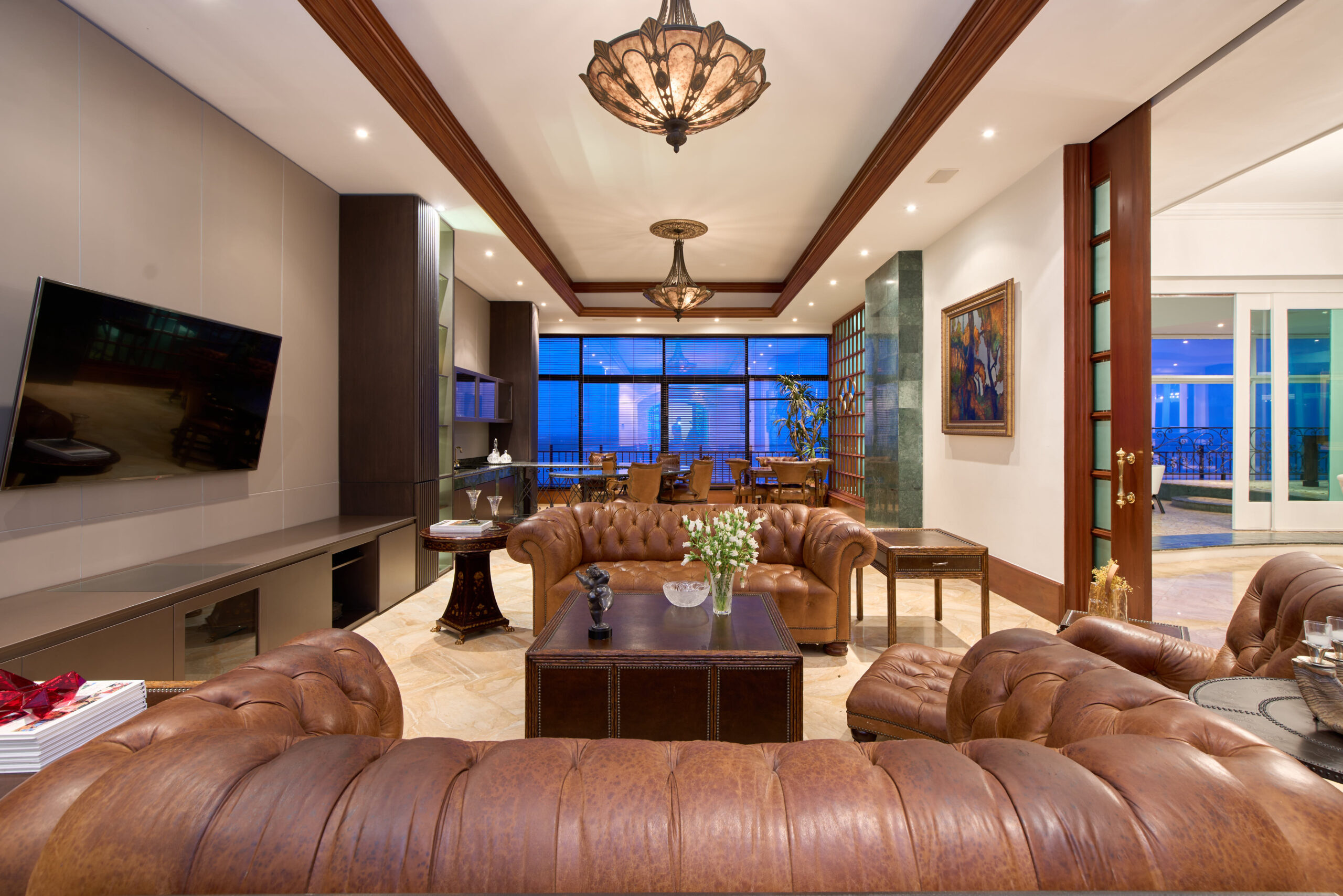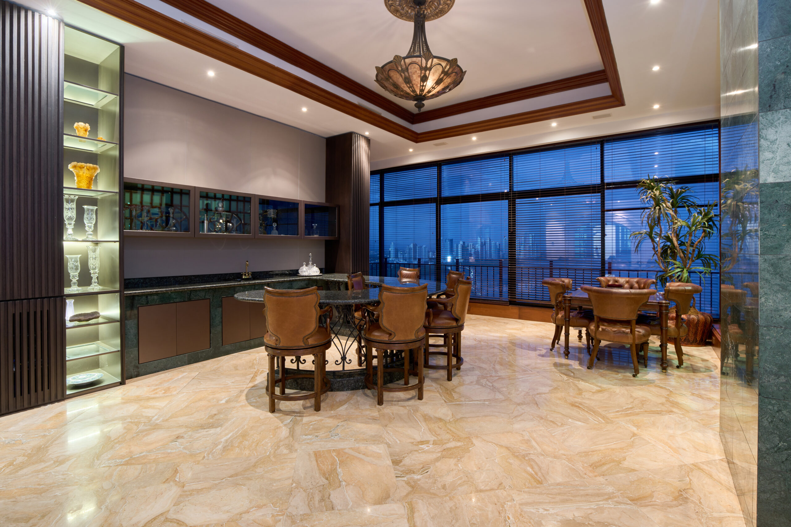 Detalles de Lujo: Acabados en mármol y madera, ventanales de piso a techo, cenefas decorativas con iluminación ambiental, y puertas de madera de doble apertura.