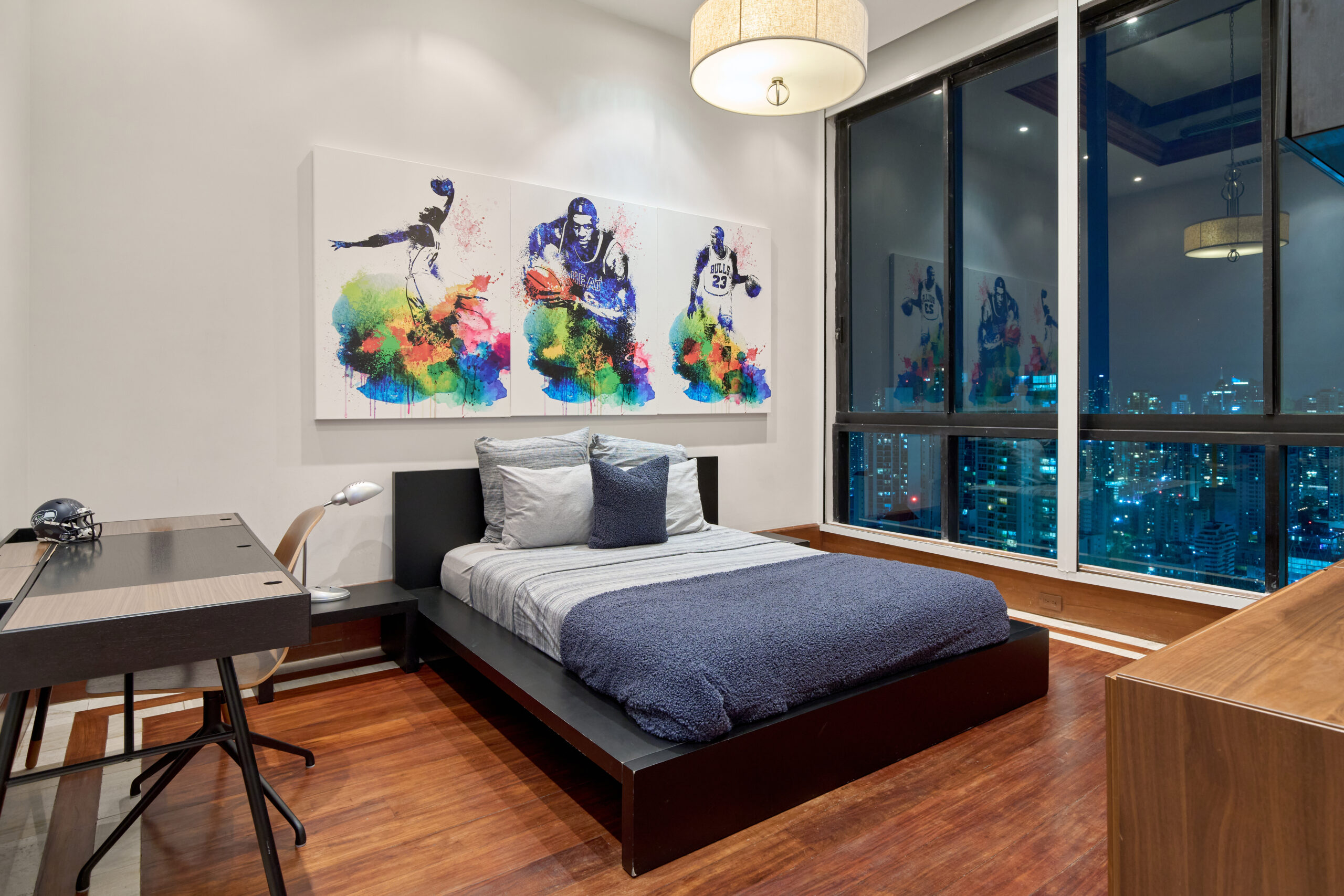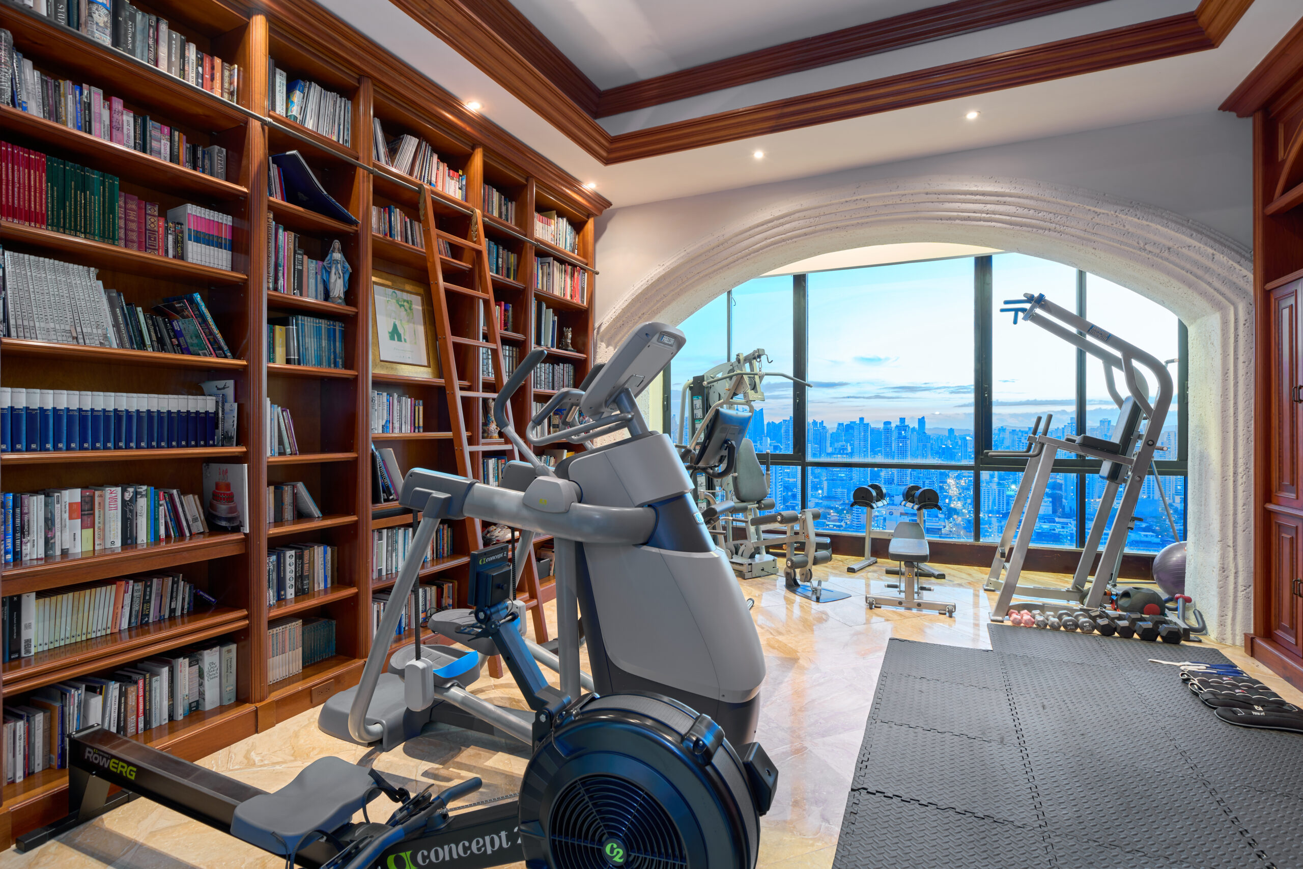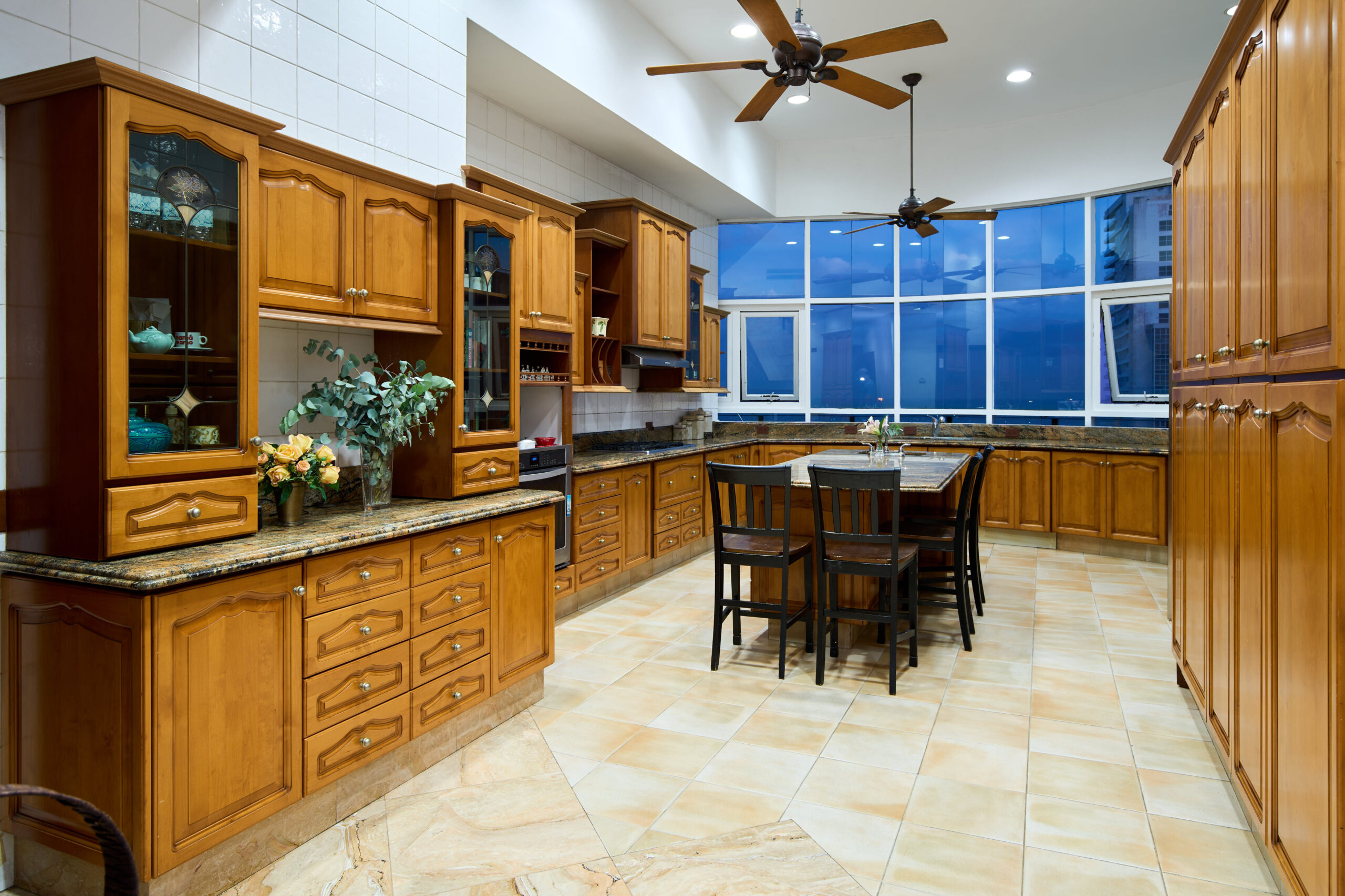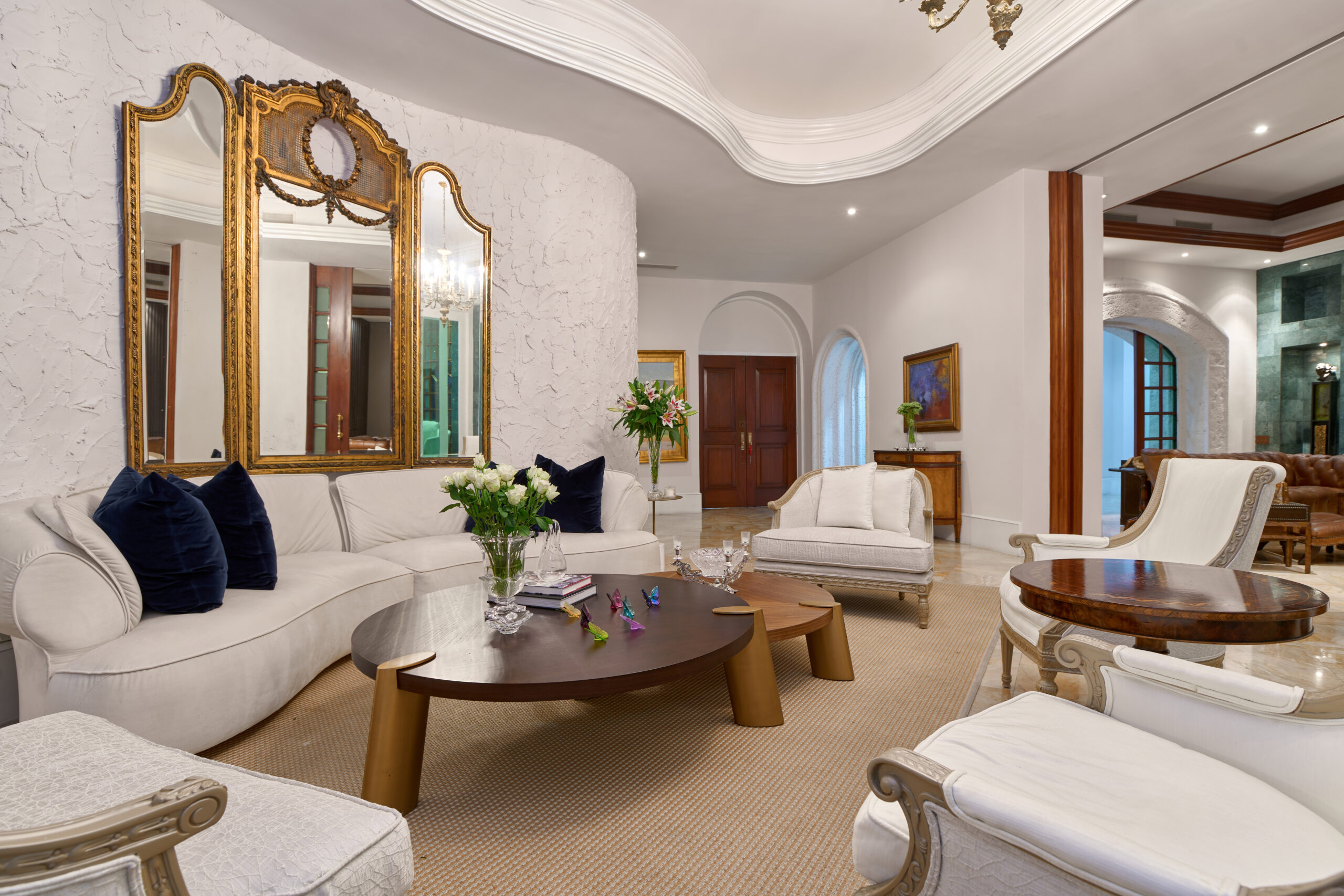 Detalles de Lujo: Acabados en mármol y madera, ventanales de piso a techo, cenefas decorativas con iluminación ambiental, y puertas de madera de doble apertura.