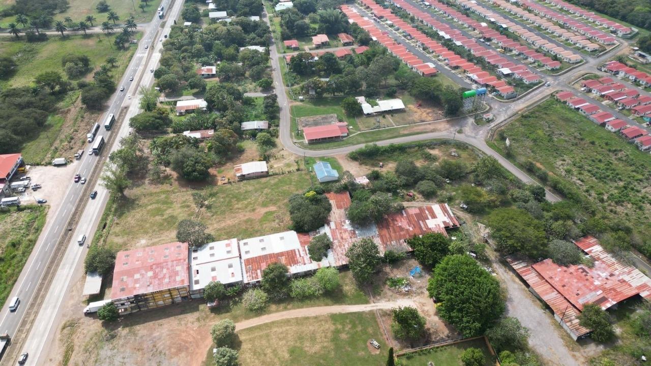 Venta de Terreno con Galera en Aguadulce, Coclé, frente a Via Panamericana 6,978.02 m2 de terreno cuenta con 50m de frente en la interamericana y se extiende 192.86m hasta atras, frente con acceso entrada y salida carretera principal en la parte trasera de la propiedad para maniobras en el trasporte, equipo pesado etc.